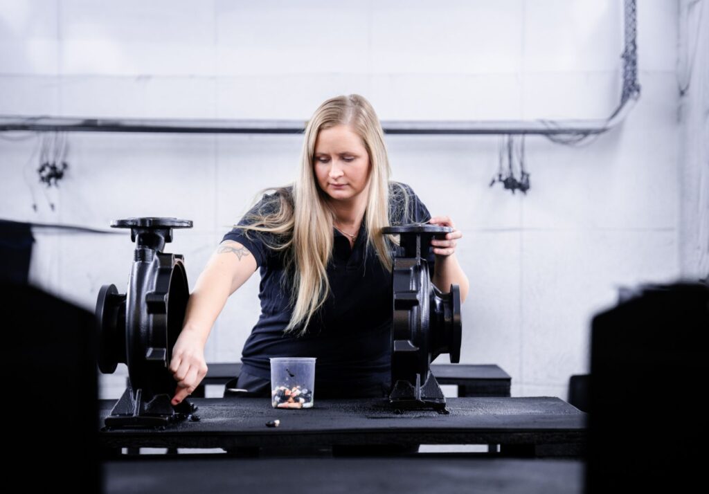 Verkstedet er utstyrt med det nyeste av maskiner og teknologi, attpåtil landets grønneste lakkeringshall. Her jobber Susanne daglig med demontering og pussing av ulike pumpedeler, før hun deretter spraylakkerer og monterer dem sammen igjen klart til neste ledd.
